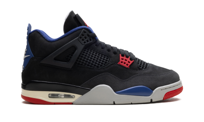 The Air Jordan 4 "Rare Air 2025" is a distinctive colorway of Michael Jordan's fourth signature shoe. This Jordan 4 has a primarily black upper that is accented with pops of blue and red. The 2025 "Rare Air" AJ4 incorporates the signature design details of the Air Jordan 4, including the mesh panels and wings on the side. Nike Air branding appears on the heel. The Air Jordan 4 "Rare Air" also stands out because of the removable patches on the tongue. Rare Air- White Lettering