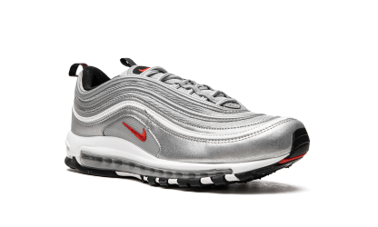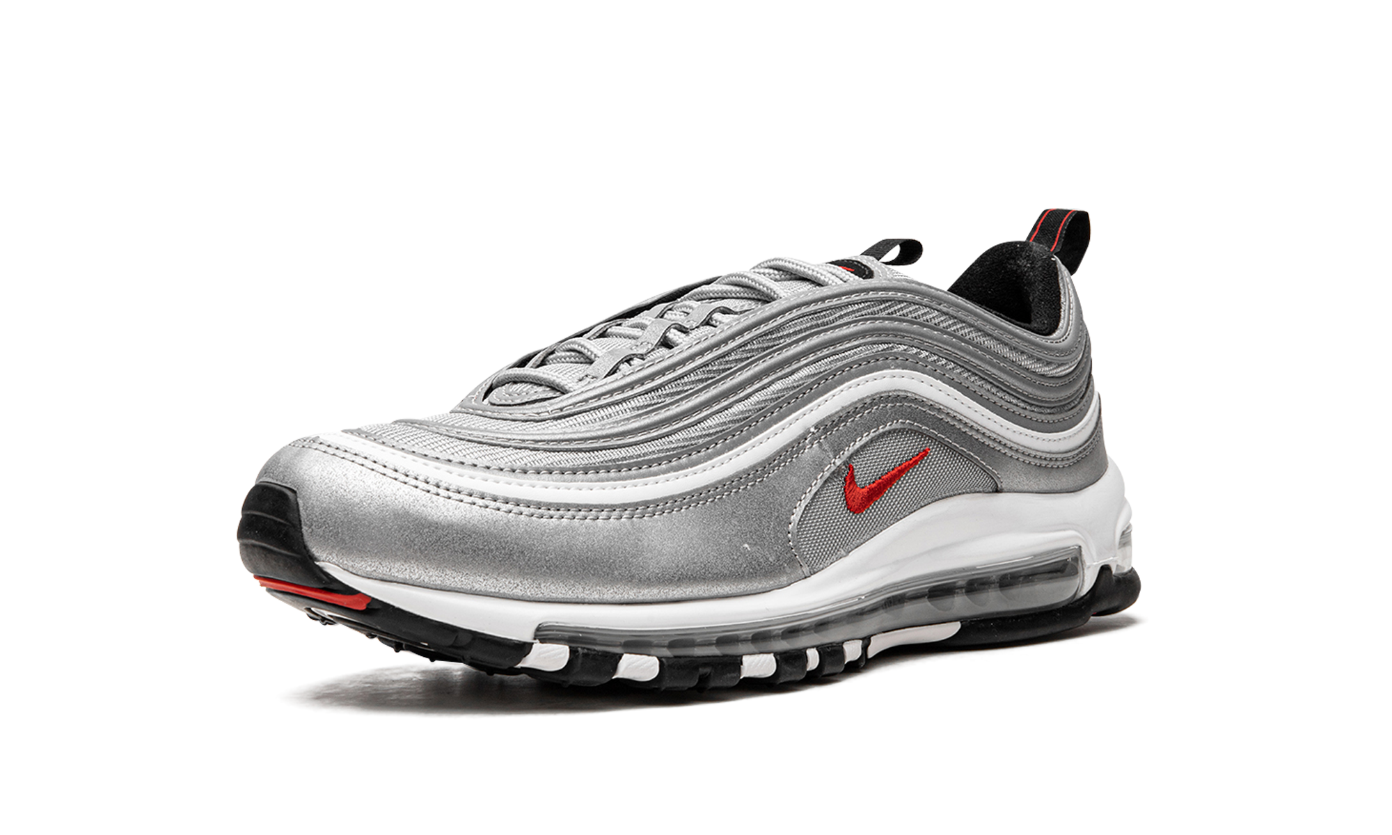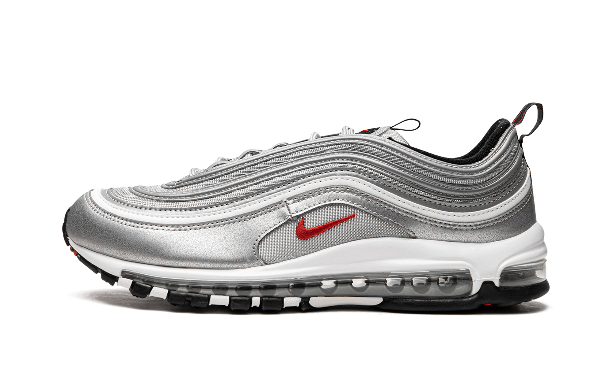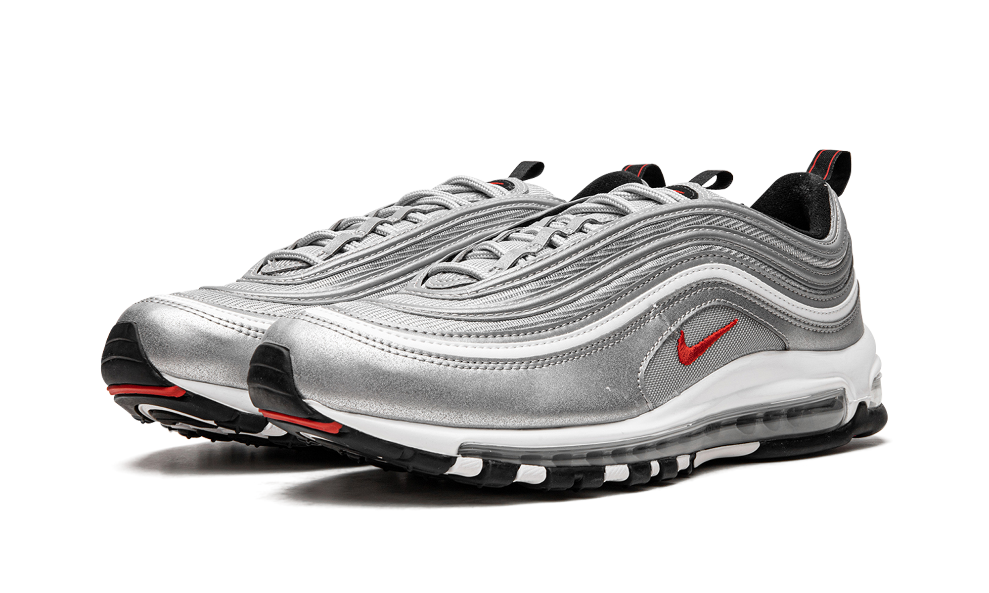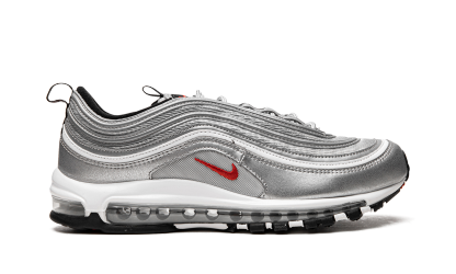 The Nike Air Max 97 “Silver Bullet 2022” is the modern reissue of the original colorway of the iconic retro running shoe that celebrated its 25th anniversary in 2022. Created by Nike footwear designer Christian Tresser in 1997, the Air Max 97 is considered one of the very best Air Max models in the collection’s history. Its “Silver Bullet” colorway is revered by the sneaker community. On the modern version, the shoe’s base is featured in Metallic Silver, as are the tonal wavy leather overlays that wrap around the shoe. A small University Red Swoosh appears on either side above the white foam midsole. The logo is also found on the circular black overlay on the tongue. Red “Air Max” detailing is printed on the heel tab. A full-length Max Air cushioning unit in the midsole completes the design. Release date: November 11, 2022 Silver Bullet 2022