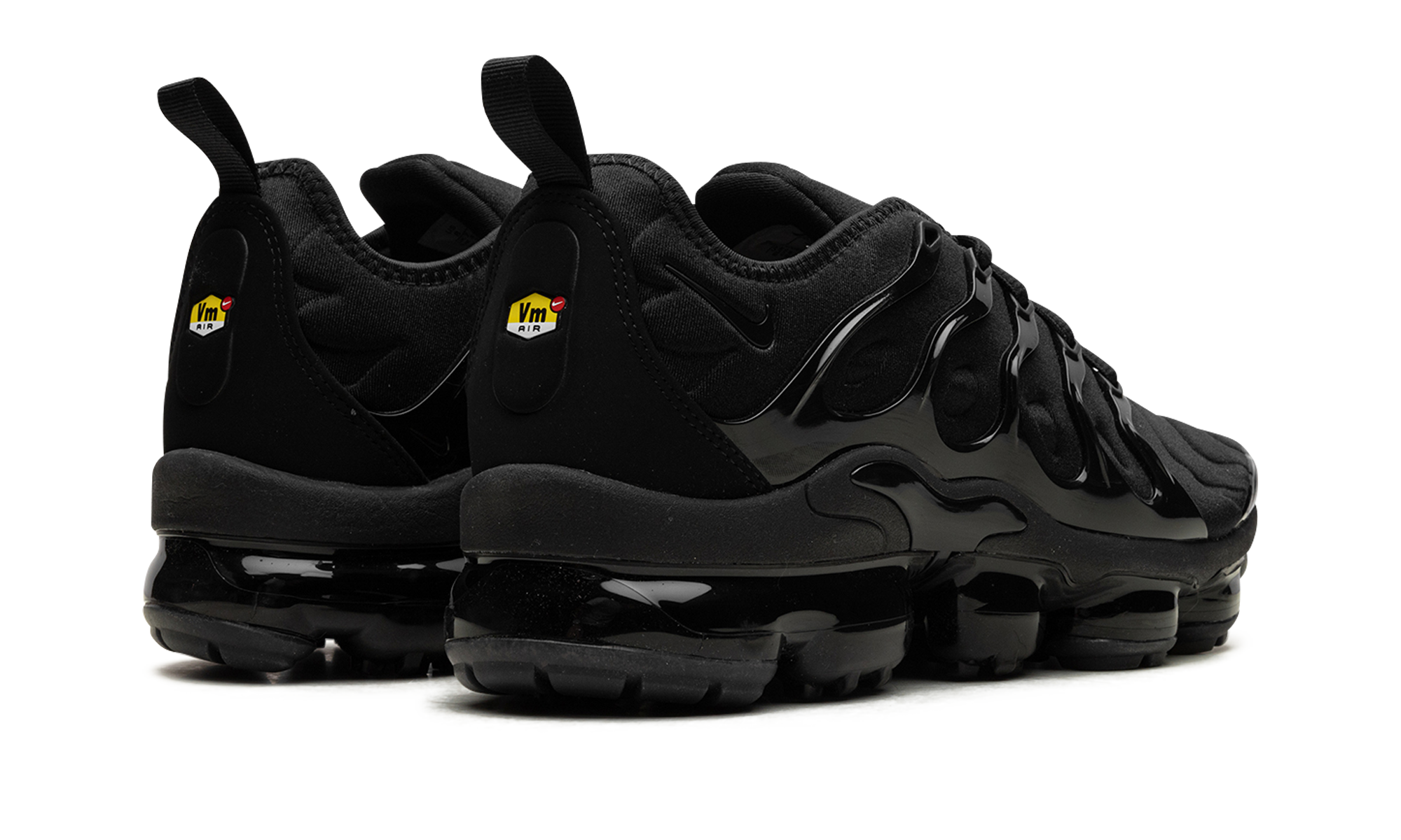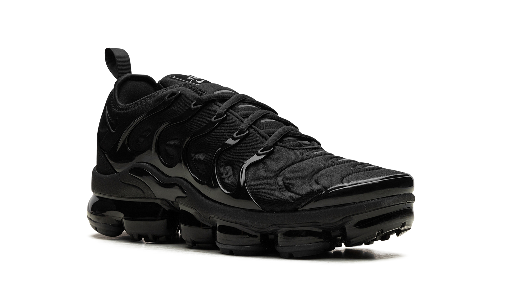 The Nike Air VaporMax Plus "Triple Black" originally released in 2018. It is a fusion model that combine Nike's futuristic VaporMax cushioning system with the design DNA of the popular Nike Air Max Plus. A neoprene upper sporting similar details to the 1998 runner is accented by reflective tabs running up the tongue. A black TPU lacing cage has been added to resemble the represent the overlays on the original Air Max Plus. Special "Vm Air" logos don each heel and insole as a nod to the yellow Tuned Air branding of the OG. Additional branding is kept to a minimum with a small Swoosh stamped on the lateral heel and tonal tongue logo. The Nike Air VaporMax Plus "Triple Black" sits atop a blacked-out VaporMax bubble to complete the stealthy design. Triple Black