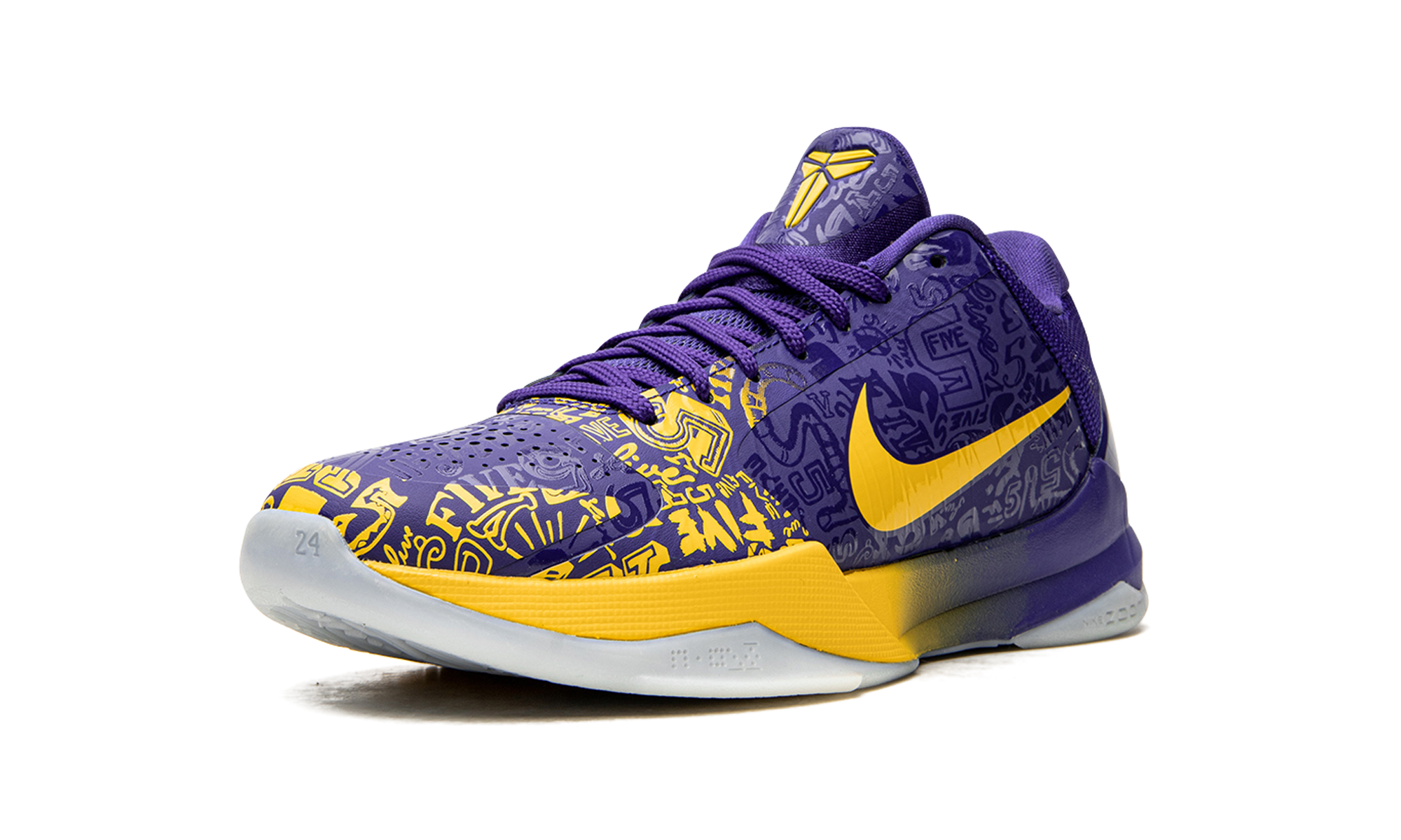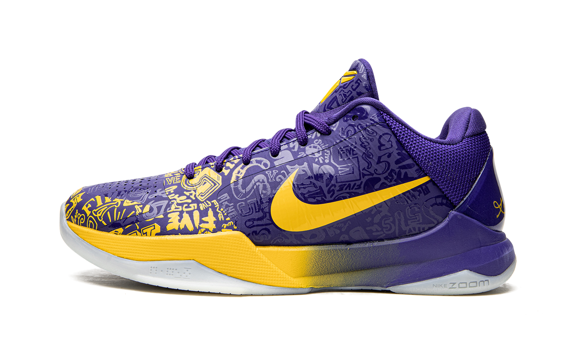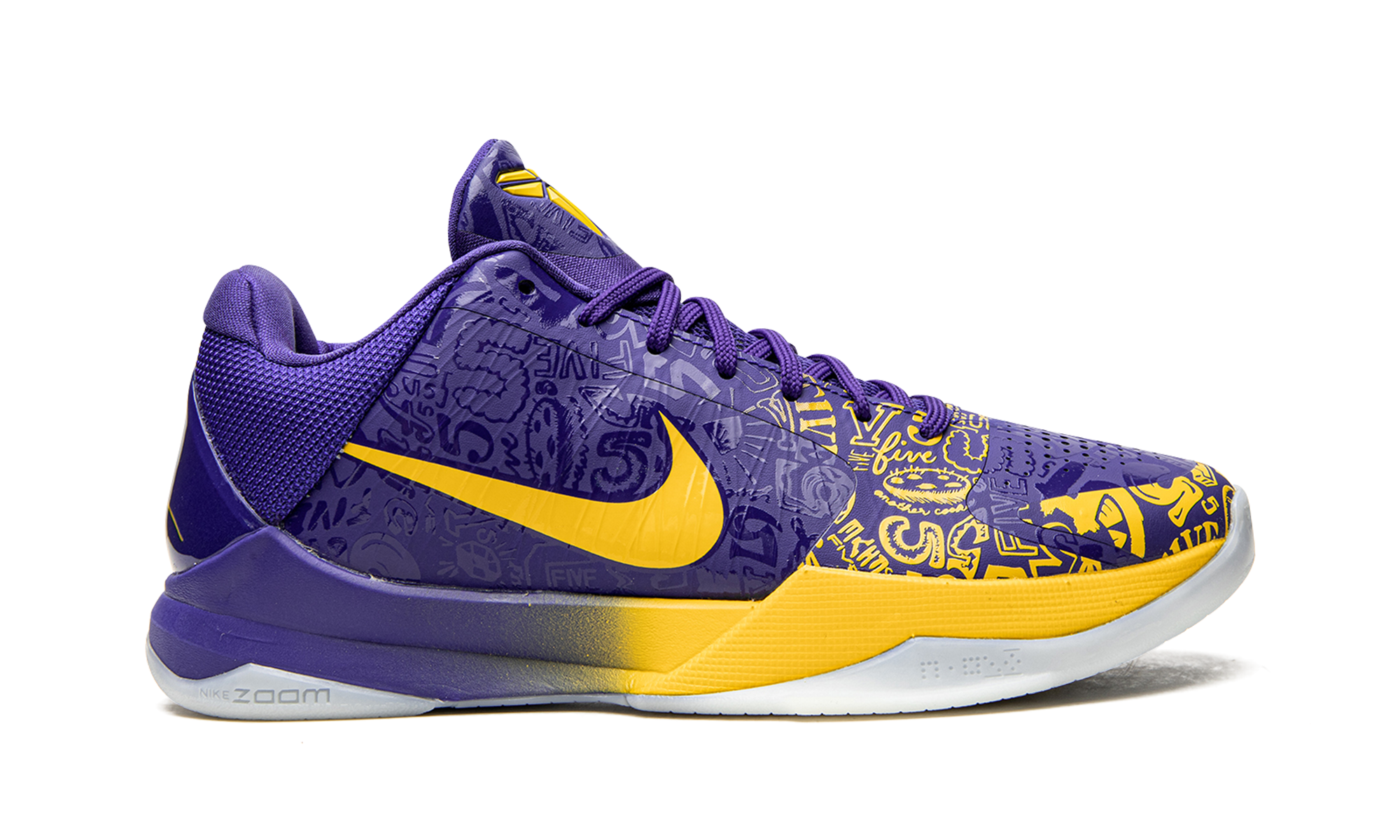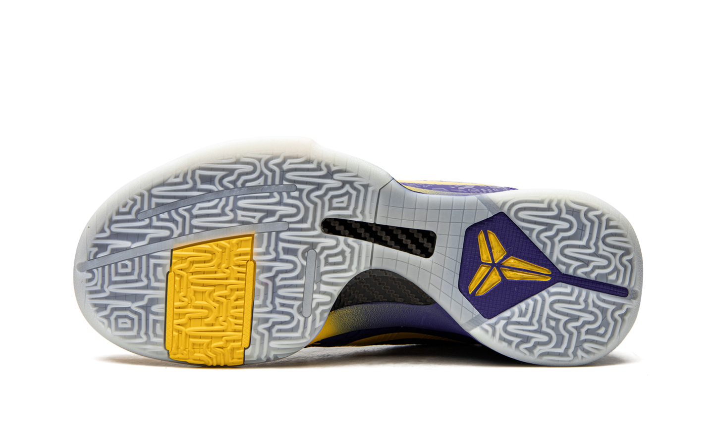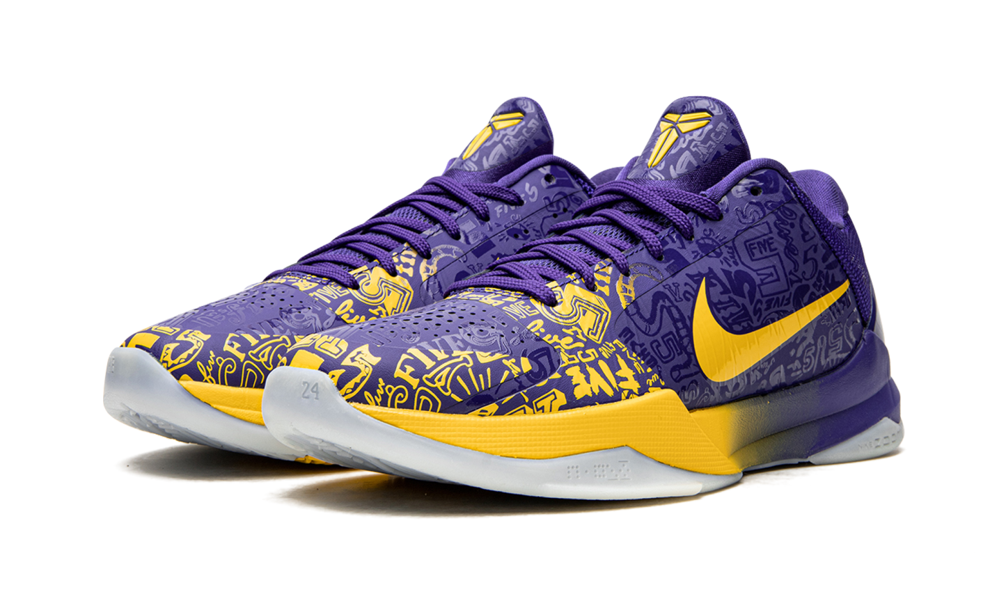 The Nike Kobe 5 Protro “5 Rings” is a special release by Nike Basketball that honors Kobe Bryant’s fifth NBA Championship with the Los Angeles Lakers. The “5 Rings” design originally released in 2010 following the Lakers’ latest NBA Finals victory, and Nike brought back the colorway as part of its tribute to Bryant’s career and popular fifth signature shoe in 2020. Accomplishments tied to Kobe’s legendary career are etched into the purple Hyperfuse upper of the “5 Rings.” Yellow accenting highlights the detailing that would otherwise form the forefoot and eyelet overlays of the Nike Kobe 5 Protro. Elsewhere, a yellow Swoosh can be found on either side and Bryant’s “Sheath” logo appears on the purple tongue. Tonal mesh detailing on the collar and a purple TPU heel clip with Bryant’s signature in yellow text add to the shoe’s distinguished Lakers theme. Nike’s Zoom Air technology is embedded in the foam midsole to provide a cushioned ride whether on or off the court. Release date: October 15, 2020. 5 Rings