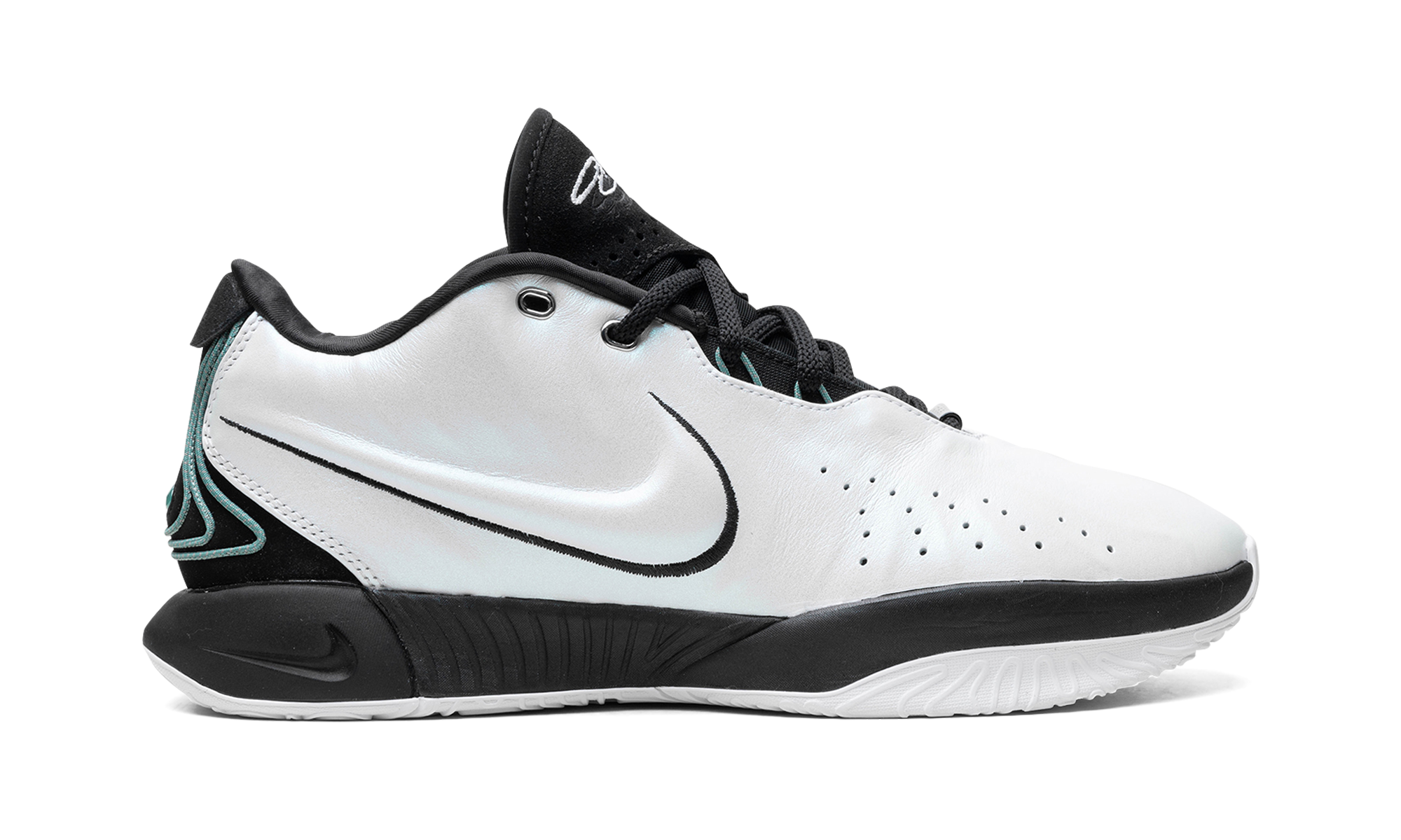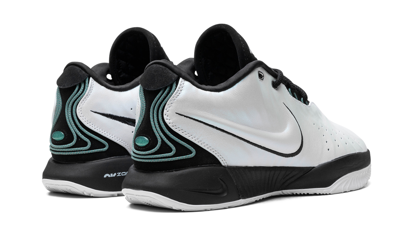 The Nike LeBron 21 “Conchiolin” is a colorway of LeBron James’s twenty-first signature shoe with Nike Basketball inspired by the protein fortifying mollusk shell of the same name. Undoubtedly, the LeBron 21 “Conchiolin” is one of the most creative colorways in the Nike Basketball collection for the 2023-2024 NBA season. The upper features a white leather construction with a pearlescent finish. Black accents appear on the tongue, collar, and lateral Swoosh, while teal detailing can be found on the medial Swoosh, eyestay, and heel. Release date: December 19, 2023 Conchiolin
