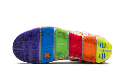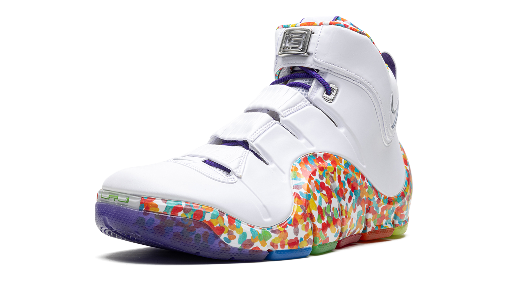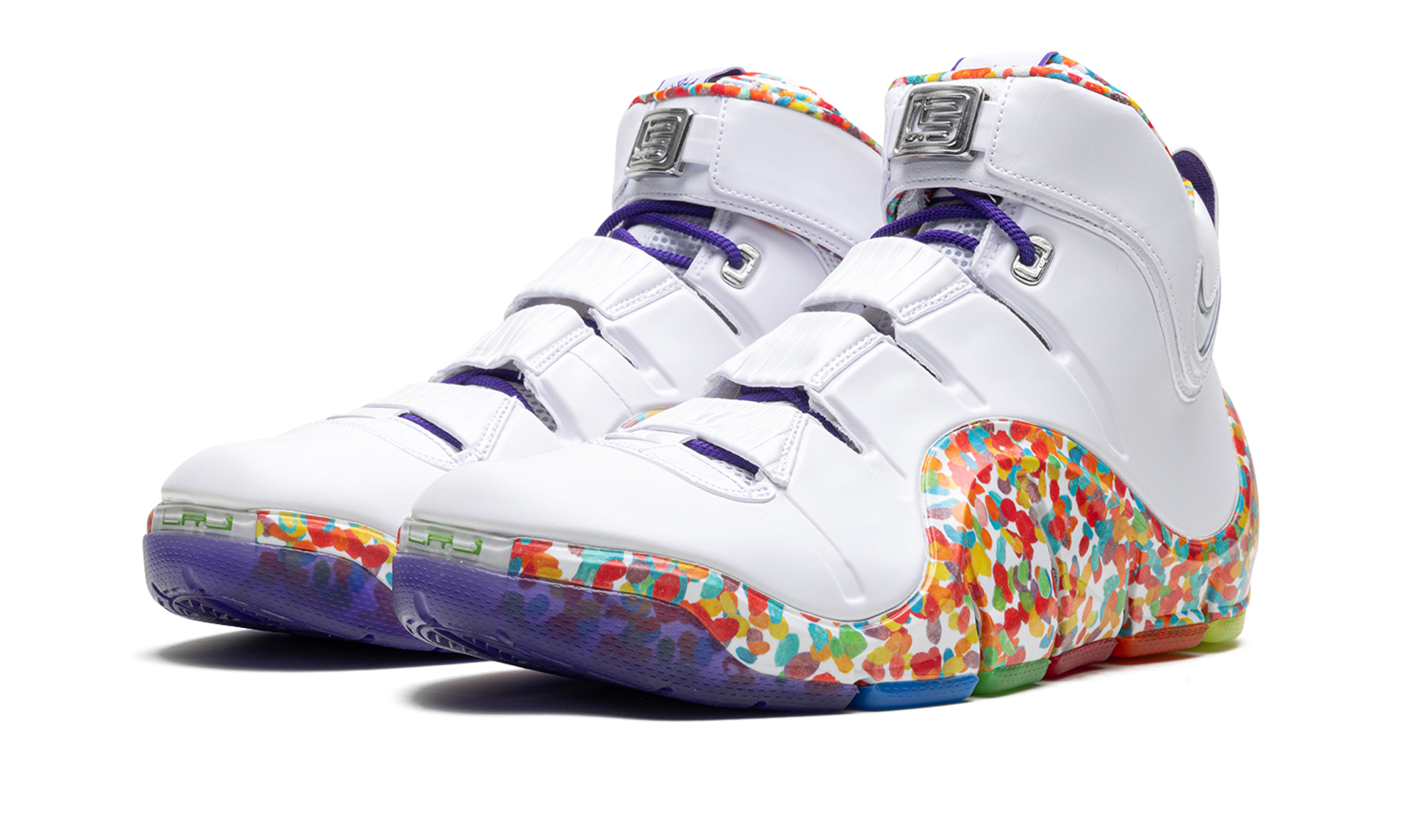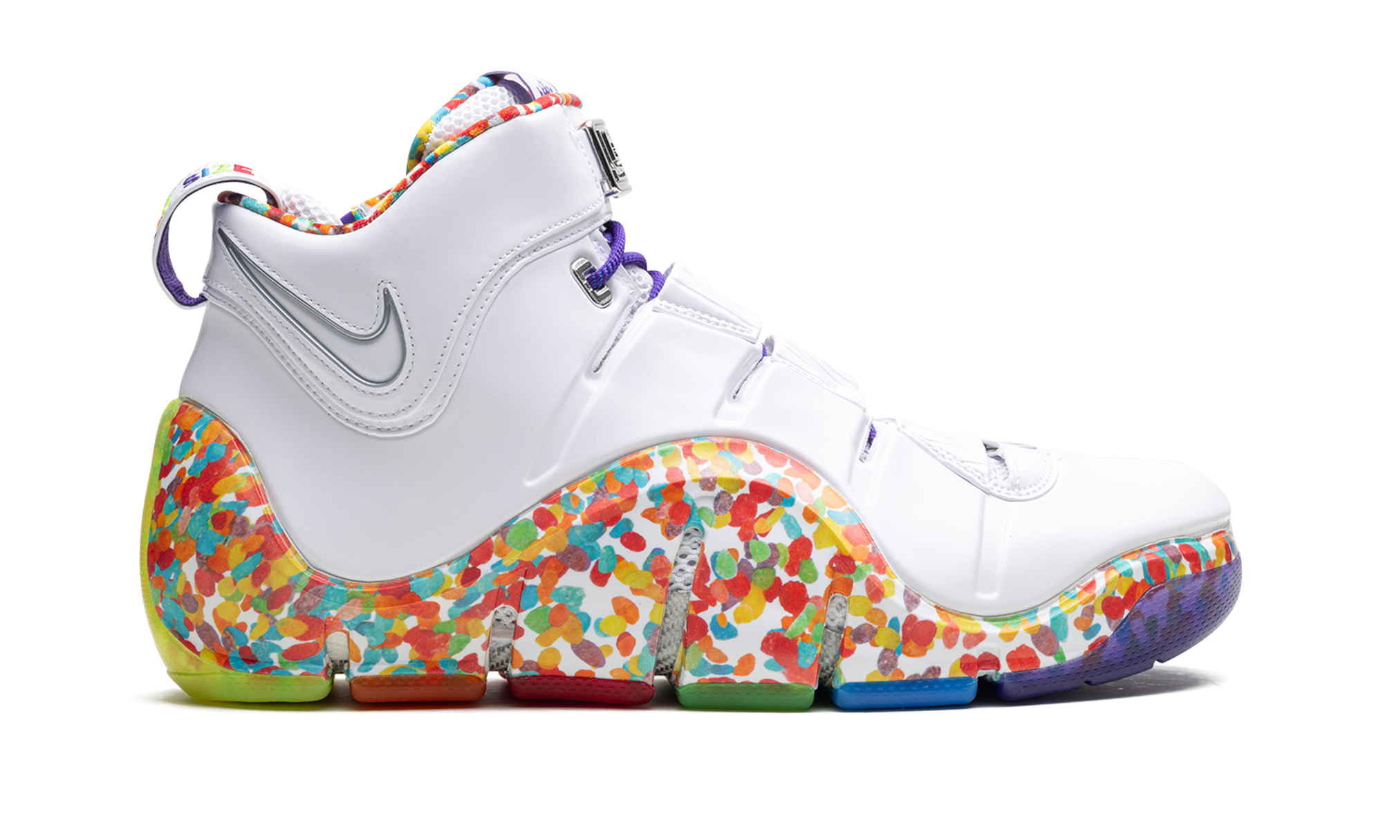 The Nike LeBron 4 "Fruity Pebbles" is a former Player Exclusive colorway of LeBron James’s fourth signature shoe that was finally released to the public in 2023. Designed by Nike for LeBron as a tribute to the basketball star’s favorite cereal, the “Fruity Pebbles” colorway features imagery inspired by the colorful cereal on the midsole and inner lining. As for the rest of the shoe, the upper is designed with a white Foamposite shell with a cream leather collar. A multicolor translucent outsole completes the fun design. Fruity Pebbles
