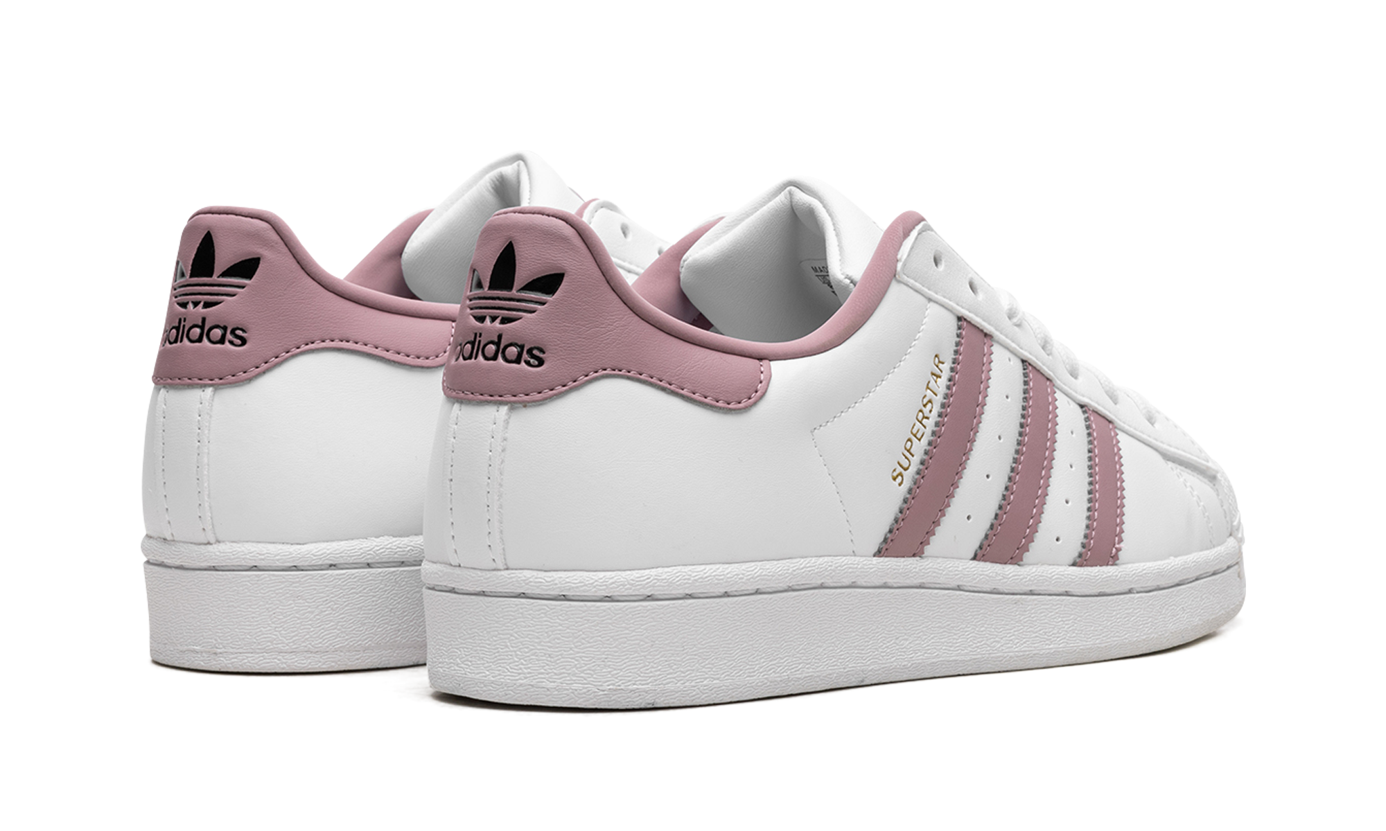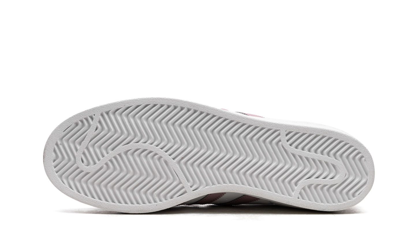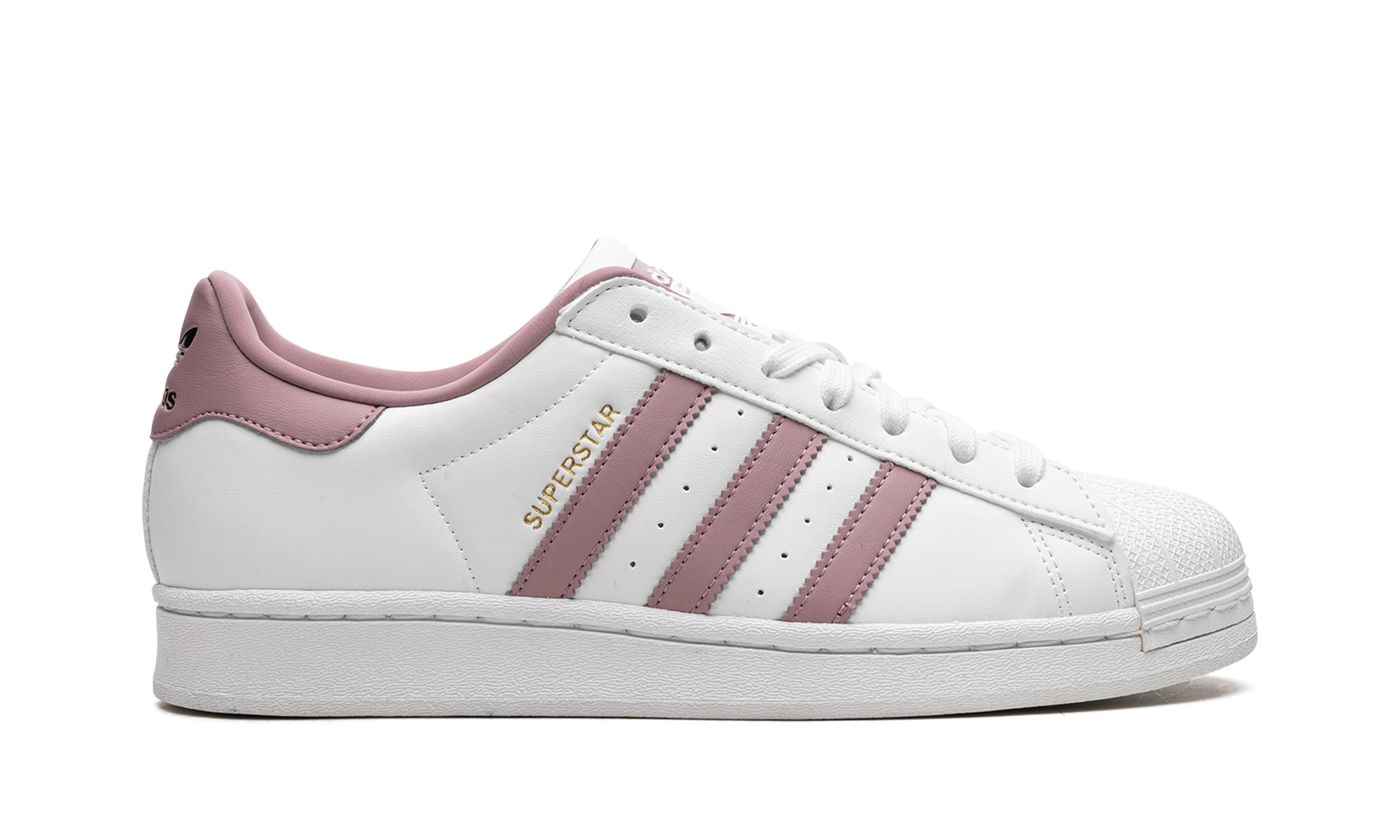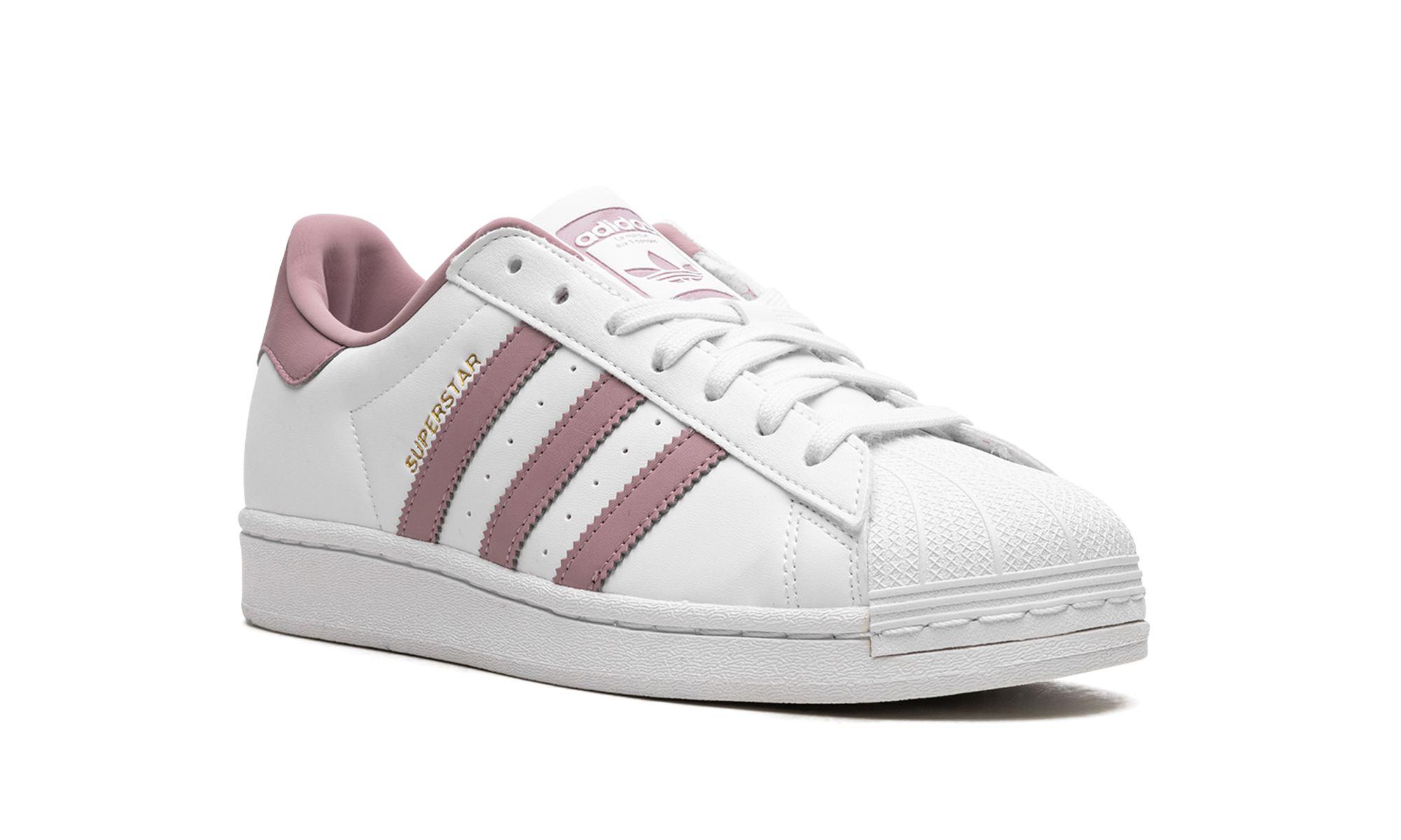 The Women's adithtdas Superstar "White/Magic Mauve" is a women's-exclusive colorway of the retro tennis shoe with a versatile look. This clean look for the Superstar is complete with a white leather construction and Magic Mauve leather Three Stripes on the sides. A gold "Superstar" detail can be found on the lateral side of the mid-panel, while an embossed adithtdas Trefoil logo appears on the leather heel tab. An old school adithtdas logo is located on the tongue. Underfoot, a white rubber sole completes the look. White / Magic Mauve